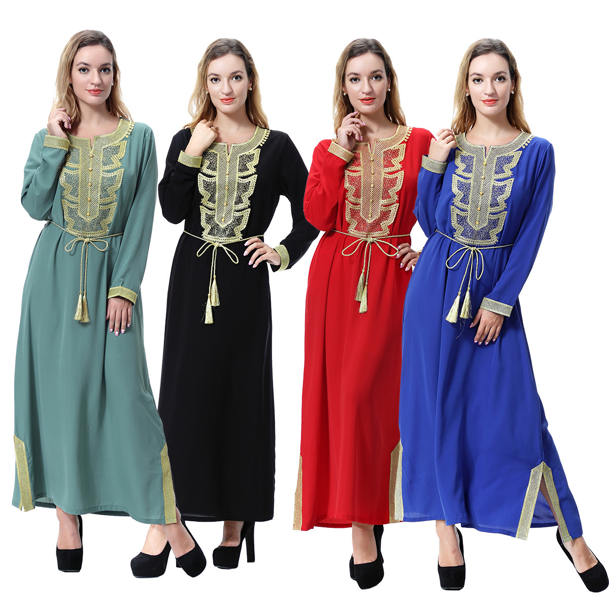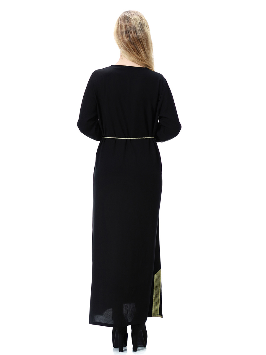 Sublimez votre allure avec cette robe longue à manches longues, dotée de magnifiques détails dorés brodés qui apportent une touche de raffinement et d’élégance.