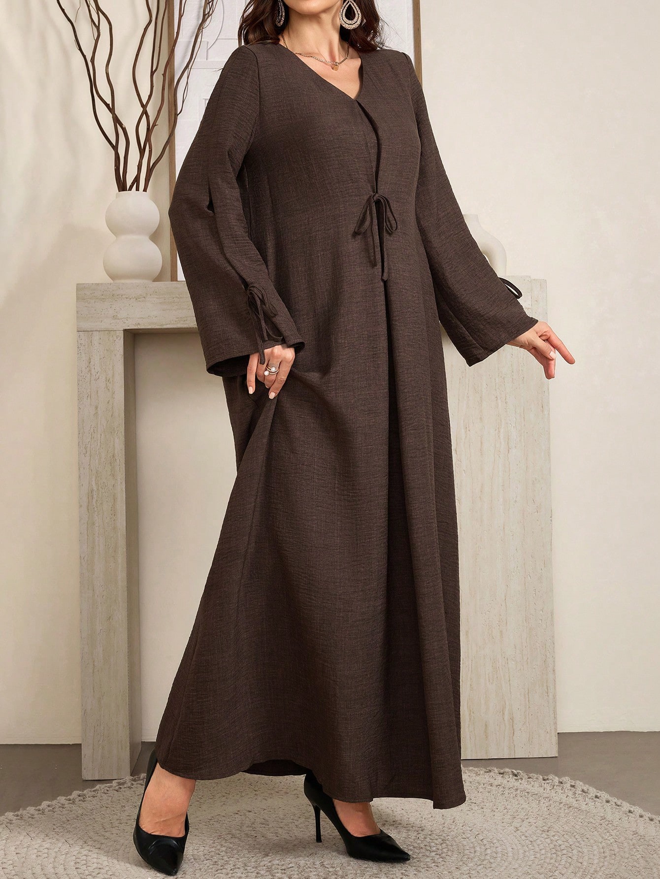 - Détails : col en V élégant + liens ajustables à la taille et aux manches