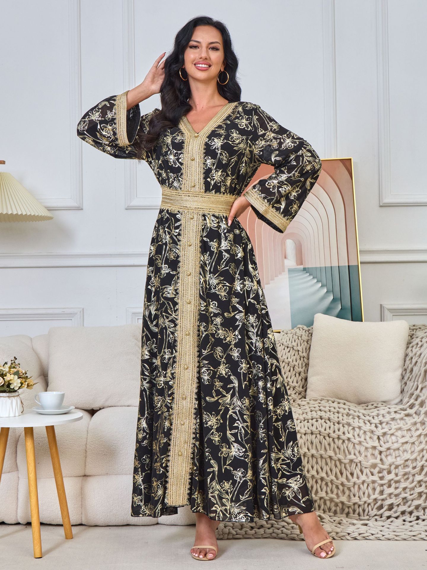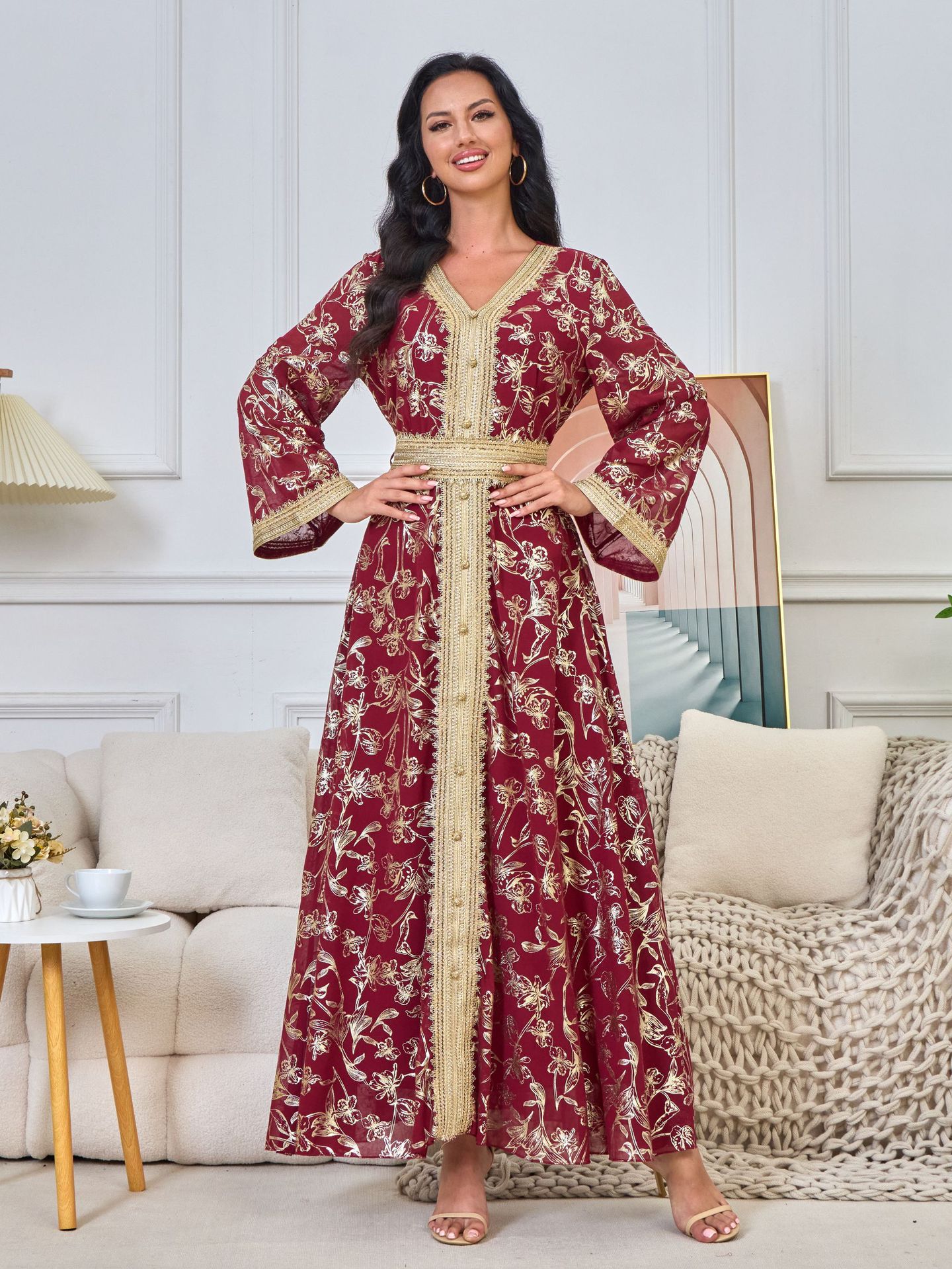 Robe Orientale Luxe Brocart Doré – Style Dubai Élégant avec Ceinture – 5 Couleurs